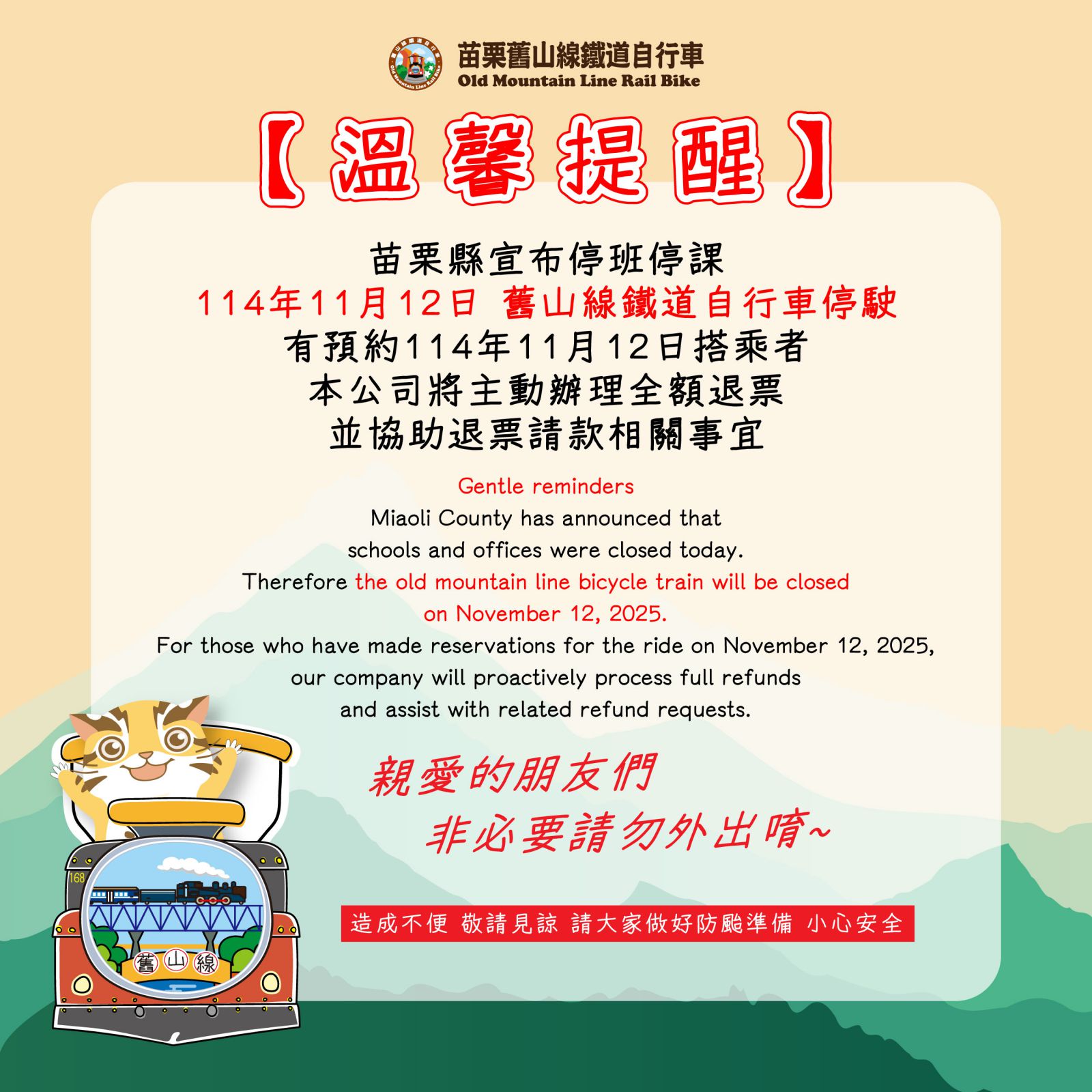 ※若因行政院人事行政局宣布(苗栗縣)因颱風天災影響當日或次日停止上班,已購票預約者,則由本公司統一進行線上退票,費用將全額退還回原支付信用卡中。